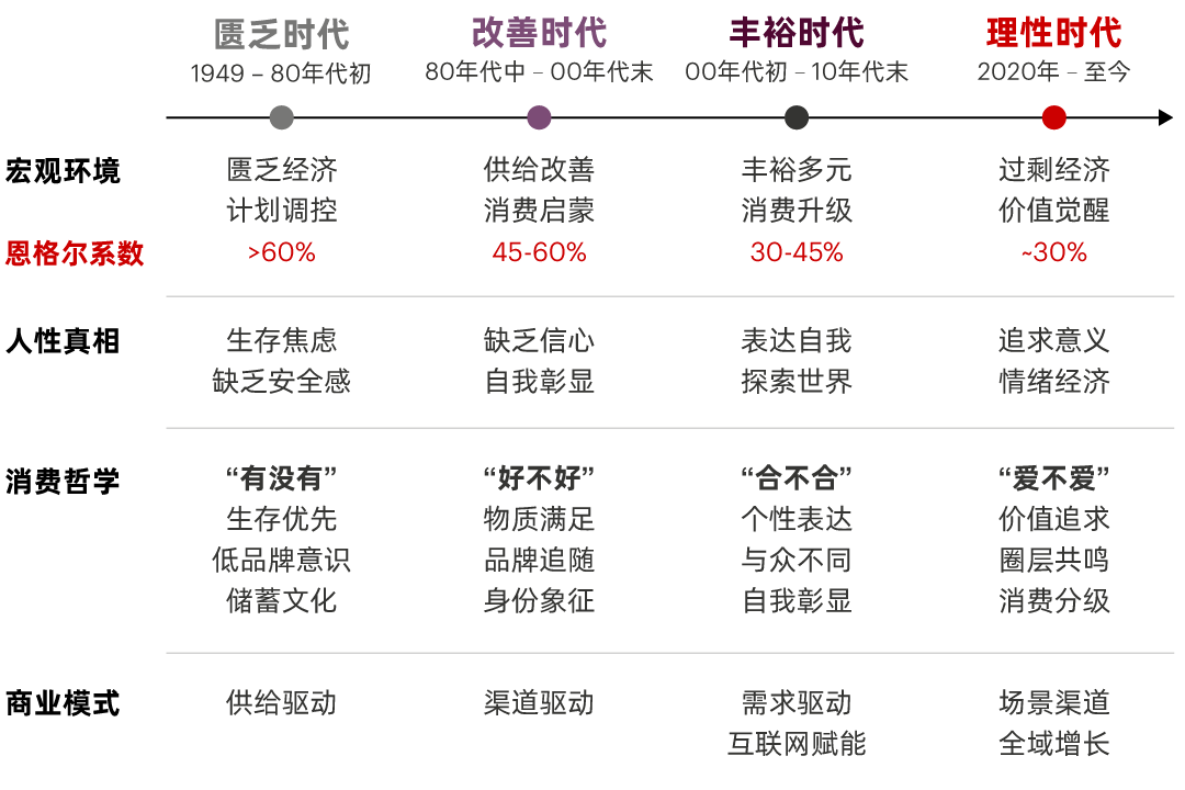中国消费市场已历经匮乏、改善、丰裕三大阶段,如今正式迈入理性时代。从“有没有”的生存优先到“爱不爱”的价值追求,从供给驱动到需求引领与全域增长,底层逻辑的迭代正在重塑市场根基(见图1)。到底是什么变了?消费者的身与心、品类的价值边界、竞争的游戏规则、渠道的纵横格局。