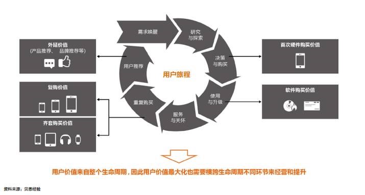 也就是说,企业要从初次接触用户开始,到用户首次购买,再到用户持续消费和重复购买中的各个环节 , 提升用户全生命周期对企业价值的贡献。尤其当企业和其所在的市场逐渐成熟时,企业将面临市场增速放缓、竞争激烈、获取新用户成本上升等问题,从而不得不将注意力由抢占市场份额、争取新用户,转移到聚焦存量用户经营以提升留存率上。