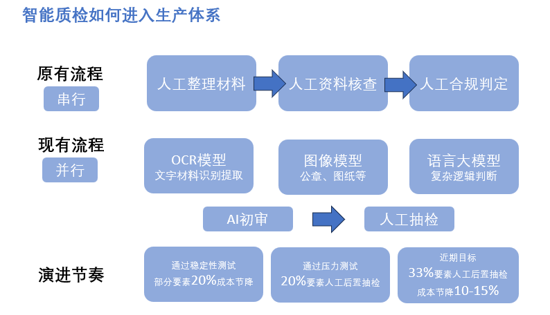 从结果来看,智能质检项目的推进节奏基本符合预期。2025年8至9月,项目完成生产环境下的稳定性测试,部分审核要素实现了约20%的成本节降;10月起,在通过大规模压力测试后,部分环节开始向AI初审、人工后置抽检转变。2025年底有约33%的审核要素实现人工后置质检,预计这一比例将进一步提升,整体成本节降幅度达到10%—15%。未来,对于AI尚不能完全替代的部分,也将通过AI筛选与辅助,减少人工信息浏览量,进一步放大效率提升效果。