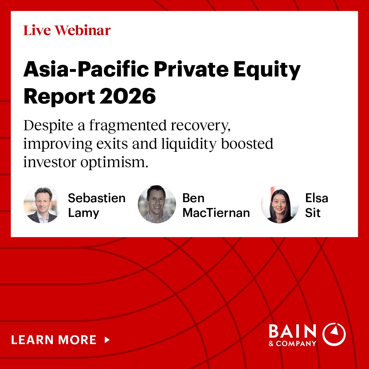 You are invited to a webinar launching Bain & Company's 2026 Asia-Pacific Private Equity Report. The webinar will provide insights from the report on the state of the Asia-Pacific private equity market and the trends that are changing the industry's landscape.